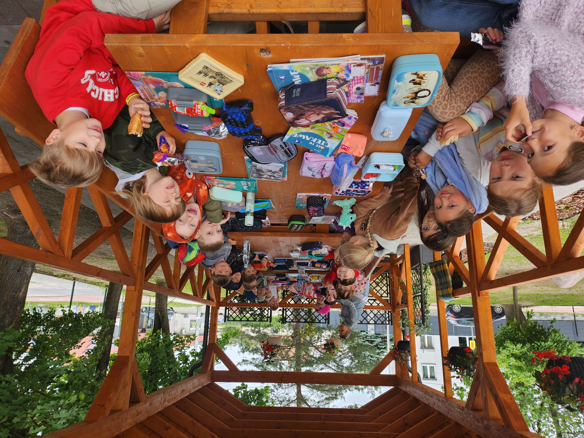 Gdy pogoda zaczęła się zmieniać, przenieśliśmy się do przestrzeni szkolnego korytarza, gdzie kontynuowaliśmy aktywności w „cieplejszych” warunkach. Na szczęście w południe zza chmur wyszło słońce – wtedy wróciliśmy na zewnątrz i urządziliśmy wspólny piknik na kocykach. Było drugie śniadanie, zabawy ruchowe w szkolnym ogrodzie i dużo radości.