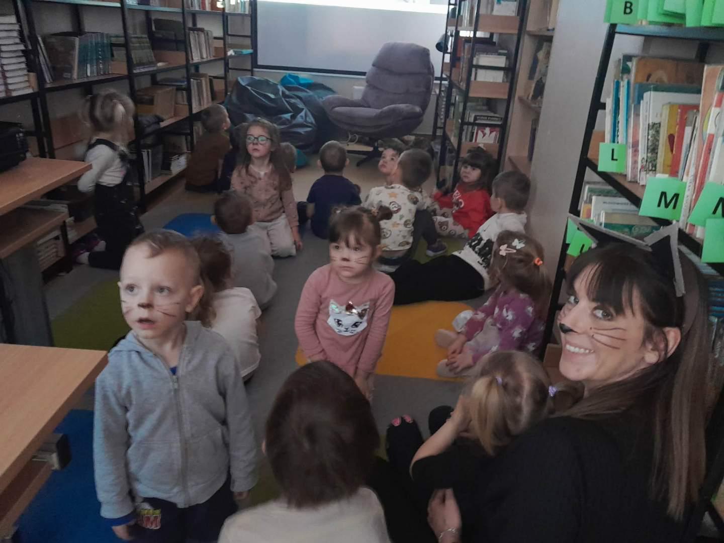 Grupa przedszkolaków odwiedziła bibliotekę szkolną przy okazji obchodów "Dnia kota". Dzieci wysłuchały opowieści o czarownicy i kotku, którym się zaopiekowała. Oglądaliśmy książki z dzikimi kotami, które tak jak nasze domowe kotki należą do rodziny kotowatych.